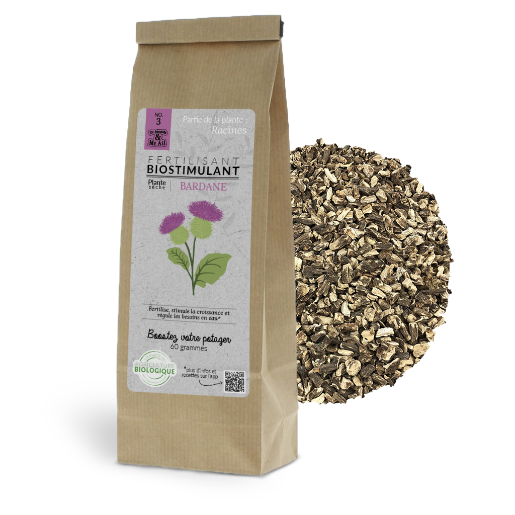 L’association purin d’ortie et purin de bardane permettra aux plantes de mieux résister aux stress hydriques liés à un excès ou une insuffisance d’eau et en pulvérisation de prévenir les champignons parasites comme le mildiou ! A utiliser en préventif en arrosage tous les 15 jours de d’avril à mai puis en en arrosage 1 fois par semaine en cas de fortes chaleurs.