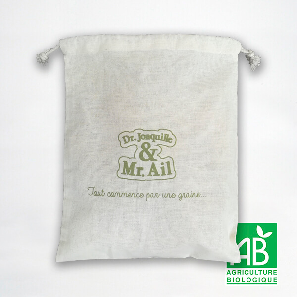 Solide et réutilisable, utilisez notre sac en coton bio Dr. Jonquille & Mr. Ail au potager.